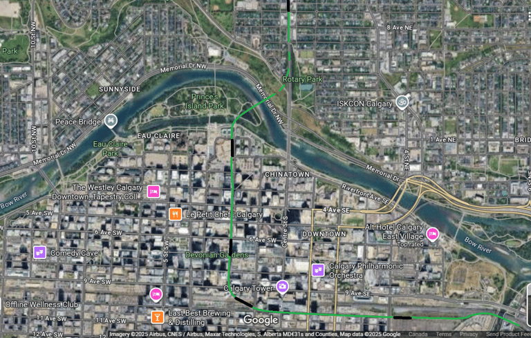 This is an idea for a compact elevated guideway through downtown Calgary along the planned route.